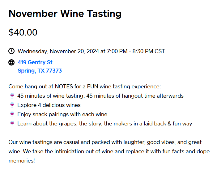 Next Wednesday, 11/20/24, there will be a wine tasting event at NOTES from 7:00pm – 8:30 pm. Check out the details below and reserve your seat before tickets sell out. The event is limited to 15 people!