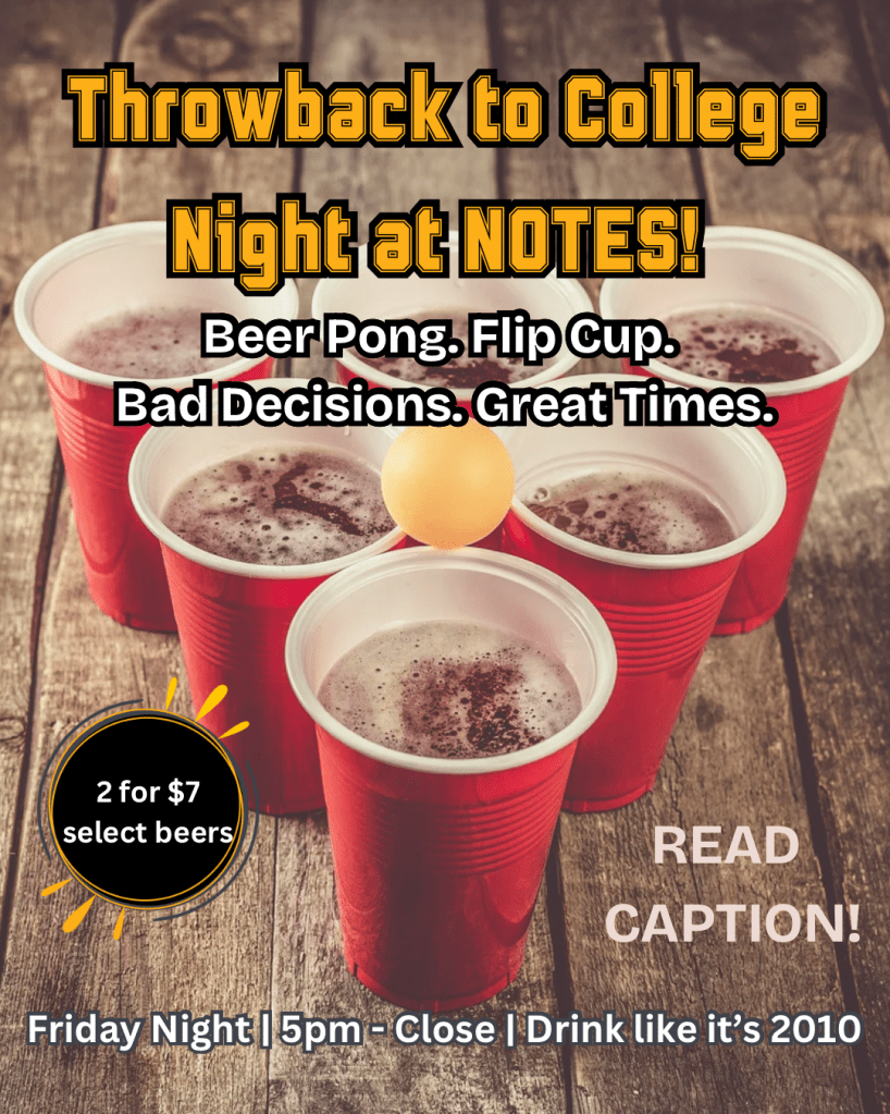 We’ve got red solo cups all night long and discounted beer to fuel your flawless beer pong form. 🎯 Or, bring your own game — any college classic game you want to rehash. You bring the spirit; we’ll bring the questionable beer. 😂